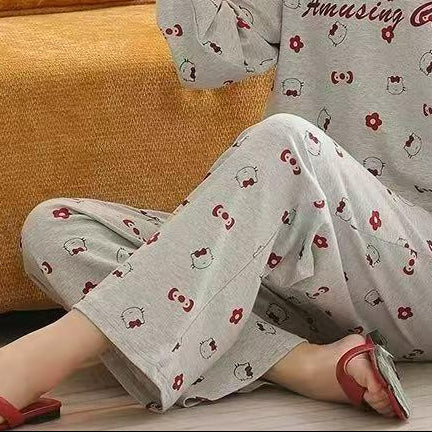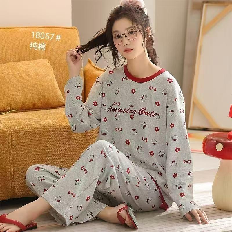 Ladies cartoon print cotton pajama set with long sleeves and elastic waist pants. Soft, breathable perfect for cozy nights and all-season wear.