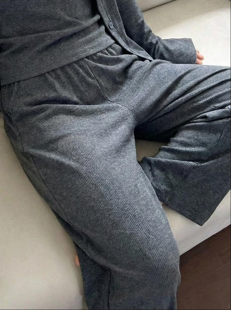 3-piece ribbed lounge set featuring a soft charcoal-gray cardigan, matching tank top, and relaxed high-waist wide-leg pants made from a stretchy, lightweight cotton fabric.