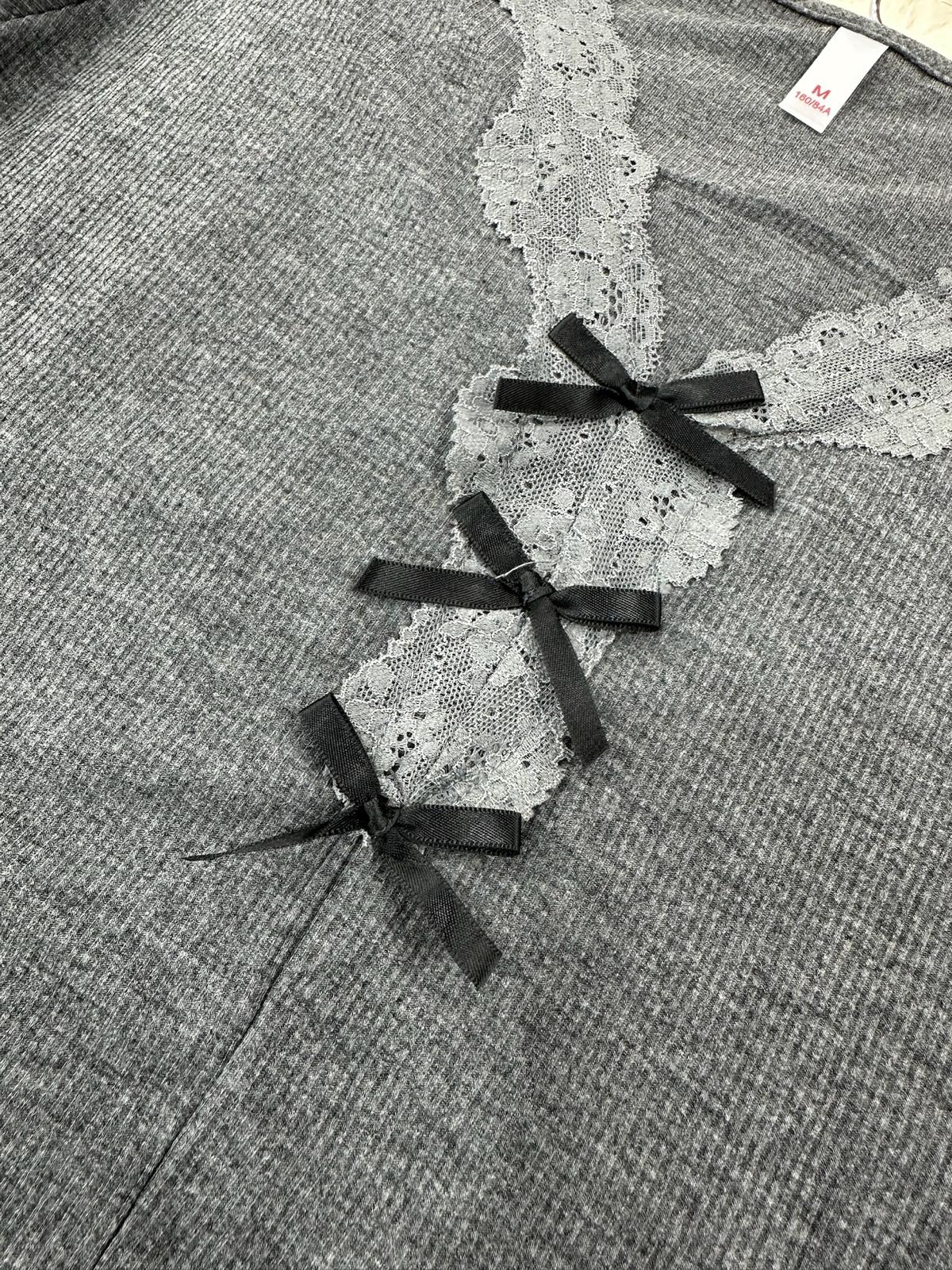 Ladies ribbed pajama set with lace trim neckline and long sleeves. Soft, stretchy sleepwear perfect for lounging and all-season comfort.