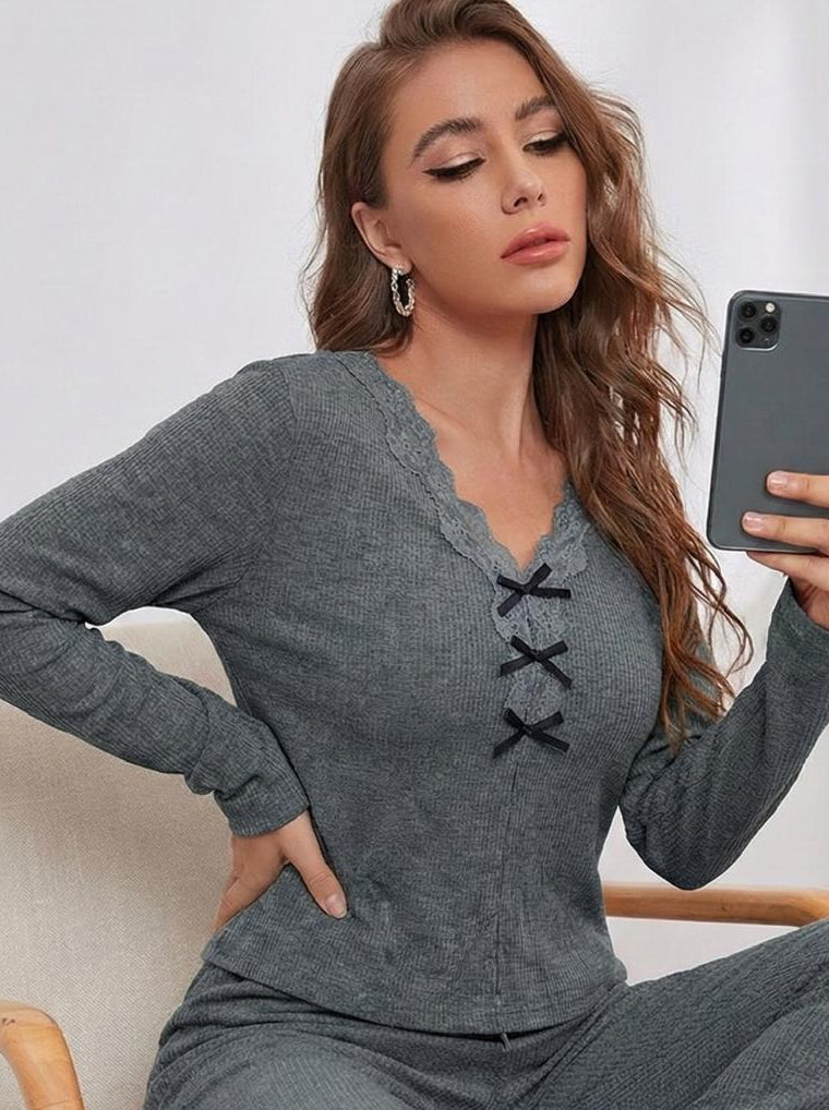 Ladies Ribbed Pajama Set – Long Sleeve Lace Trim Lounge Wear