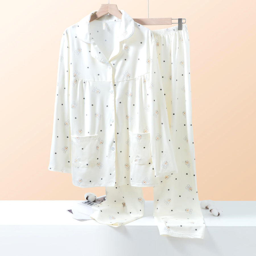 Teddy Dots Ladies Loungewear Front Open Pajama Set - White