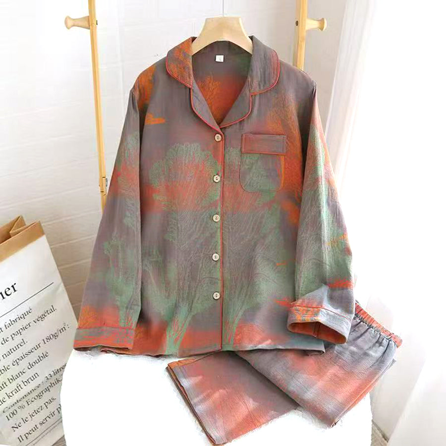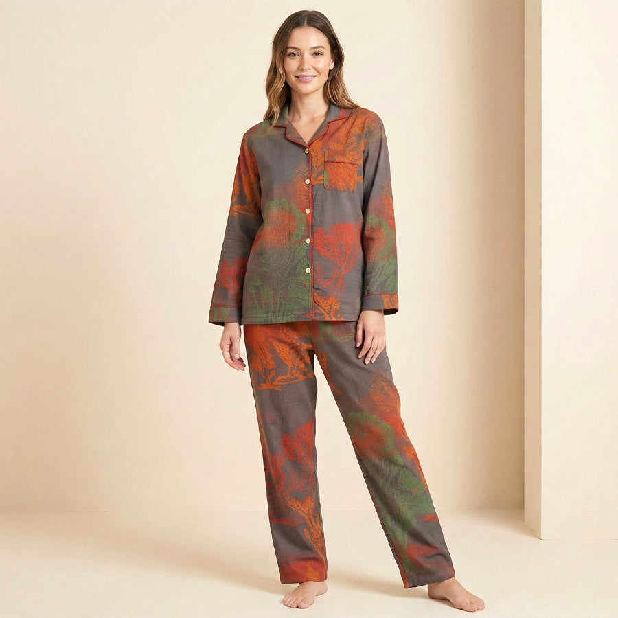 Flowers Ladies Front Open Pajama Set - Orange
