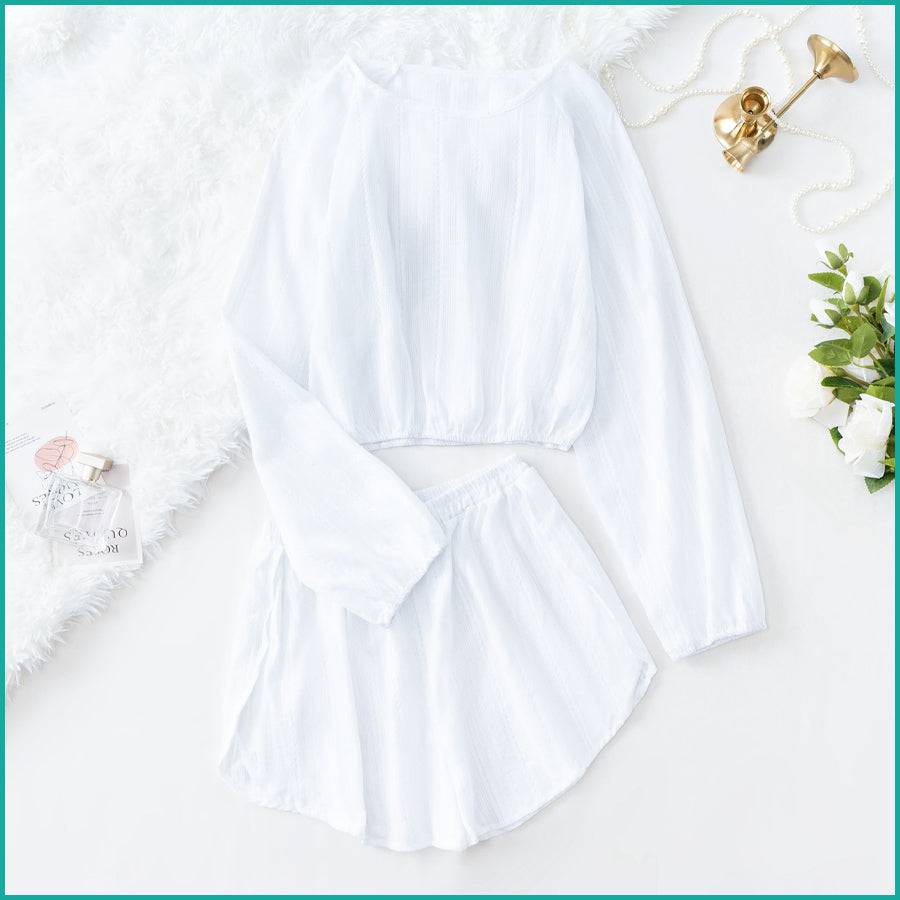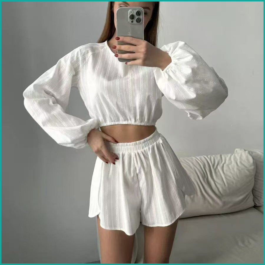 Line Ladies Crop Full Sleeves T-Shirt with Shorts - White