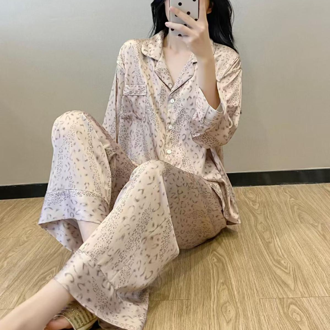 Tiger Print Ladies Front Open Pajama Set - Brown