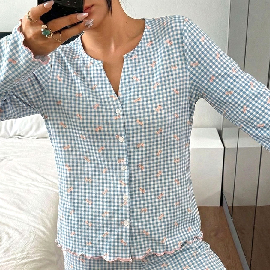 Checks Bow Ladies Pajama Set - Blue