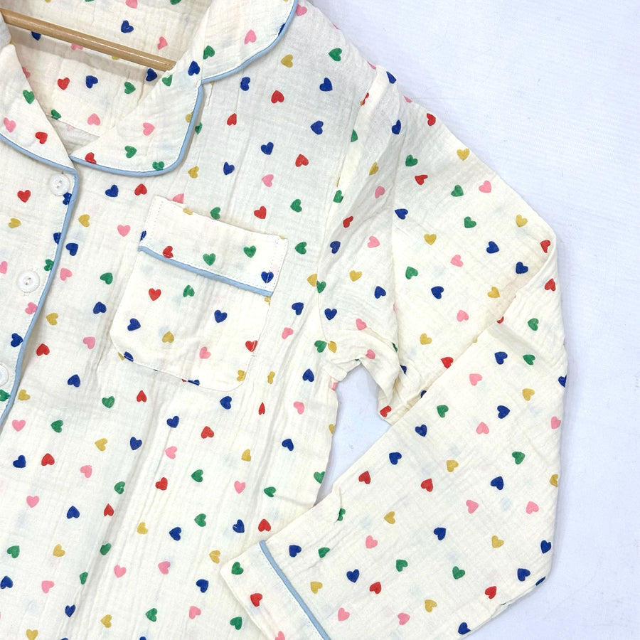Color Mini Heart Ladies Front Open Pajama Set - White