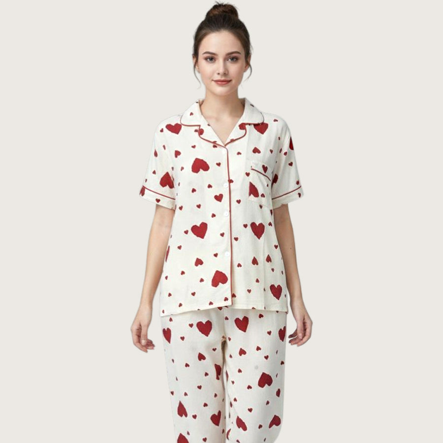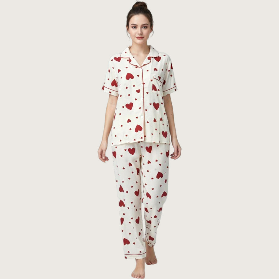 Heart Love Ladies 3 Pcs Pajama Set - White