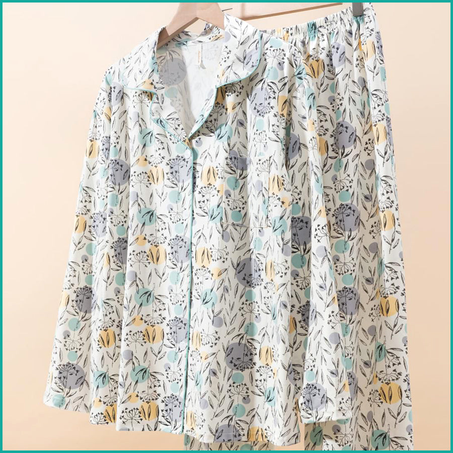 Leafs Full Sleeves Pajama Set Fine Material - White