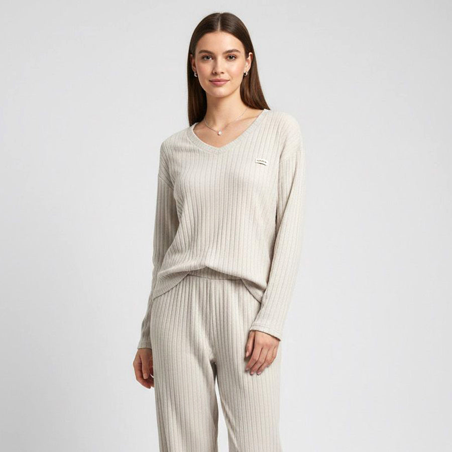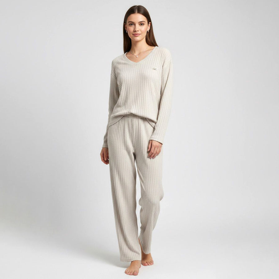 Line V-Neck Ladies Pajama Set - Cream